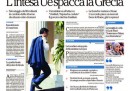 Le ultime notizie sulla Grecia sono in primo piano sui principali quotidiani in edicola col nuovo piano di salvataggio, che verrà erogato in cambio di nuove riforme strutturali e misure di austerità piuttosto severe. I toni con cui sui giornali viene presentato l'accordo, considerato da molti come la conclusione positiva della lunga trattativa tra Grecia e creditori, non sono però celebrativi: "Atene si arrende", "spacca la Grecia","Grecia svendesi", "scontro ad Atene", per citare alcuni titoli di oggi. Sulle prime pagine viene anche dato spazio al ritiro del ciclista Ivan Basso dal Tour de France dopo la scoperta di un tumore per il quale sarà presto operato e al prolungarsi della trattativa per un accordo sul nucleare iraniano. Sui giornali sportivi, oltre all'incoraggiamento per Ivan Basso della Gazzetta dello Sport, si continua a parlare di calciomercato.